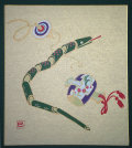 この色紙は、打ち出の小槌と竹の蛇と独楽が描かれています。