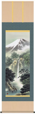 富士は百名山の長として君臨し私たちの暮らしを穏やかに見守ってくれます。雄大な瀑布が大自然の営みを感じさせてくれる荘厳な趣です。作者:鈴村秀山 略歴:グラデーションを駆使し遠景近景をうまくあらわした写実性と独創性を高い次元で融合させた画技として評価を集める。三美会会員。