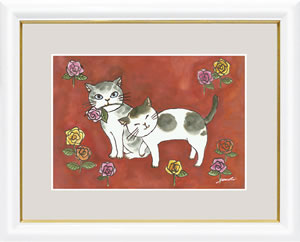 情熱のバラに囲まれた恋人同士のねこたち。凛とした雄ねこに幸せそうにすリ寄る雌ねこ。仲睦まじい様子が恋する心を応援してくれます。