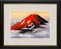 たなびく雲海から雄姿を誇らしげにあらわす霊峰。金運の象徴「赤富士」を背に七羽の鶴が虹の如く飛翔する吉祥画の名構図。鮮やかな色調で荘厳に描き上げた作品です。作者:伊藤渓山