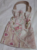 巾着のひもは、サテンリボンを使い、先や縁はレースを付けたので、細部まで女性らしさをアピール。