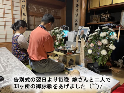 葬儀後 晩ご飯を食べてから毎晩 「33か所の御詠歌」 を満中陰まで 嫁さんと二人で唱えました (^^)/