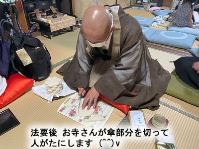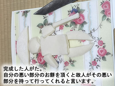 傘餅も用意をし、法要後お寺さんに 「人がた」 を作って頂き、年の順に自分の悪いところのお餅を取って