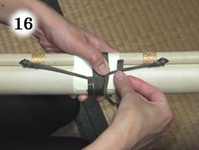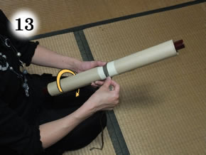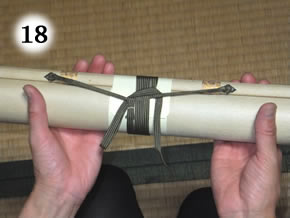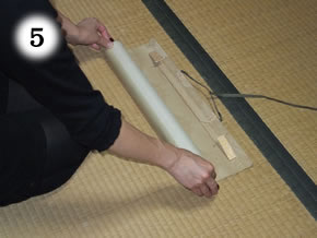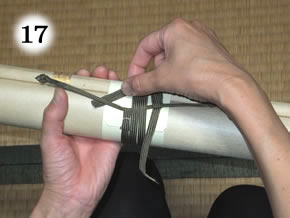 【5】 当て紙を破れに入れてしまうと方向転換が出来ないので、千枚通しのような先のとがった物で 表面に沢山の穴をあけておきます。 これは破れに当て紙を入れた後、穴に千枚通しの先を入れて 当て紙の向きを変える為です。 |