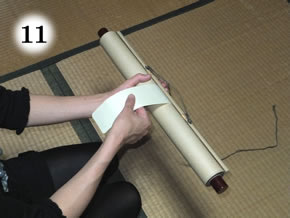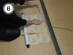 【6】 実際に破れに当て紙を入れているところです。【4】の写真と見比べれば分かりますが、最終的に収まる形と違いますね! このまま入れ込んで、90度左に回さなくては同じにならないです。 |