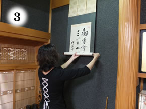 「 行 」 ・・・ 一般に最も多く用いられる仕立てで、「 本仕立 」 「 大和仕立 」上下・中・一文字の3つの裂を使う事から 「 三段仕立(表装) 」 とも言われます。